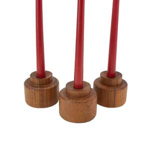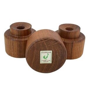 This is a set of 3 mid century modern teak candleholders crafted by Goodwood, made in Thailand. 3T x 3.5W. Goodwood, an importer, was founded in 1949 by Julie Pomerantz. The striking teak grain on this MCM candleholder is stunning. Plus, the rich honey brown complements any candle color beautifully. Perfect for 1970s table decor. Standard candles fit this candleholder. The hole measures 13/16" wide and approximately 1" deep.