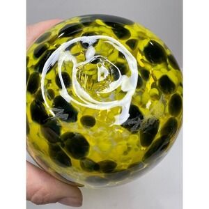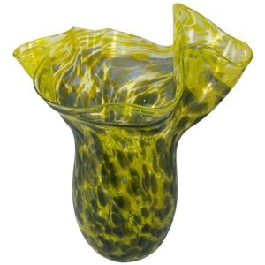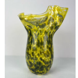 Signed Art Glass Hand Blown Vase Handkerchief 10" Mid Century Modern Yellow Glass Brown Spatter Ruffled Murano