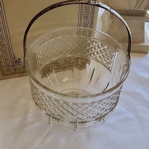 Stylish piece of 1950's pressed glass barware ice bucket. Features a hammered metal handle. Handle has rusted in several places, which adds character in my opinion