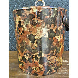 Add a touch of mmid century charm to your barware collection with this vintage Morgan Designs Bucket Brigade ice bucket. The unique tortoise pattern on this round ice bucket makes it a standout piece perfect for all occasions. Measuring 7.5 inches in diameter and 8 inches in height not including the lid, this original item is made of wood (the lid), plastic, and vinyl body. The Bucket Brigade model was manufactured in the 1960s, featuring a cool retro theme. It is in excellent preowned condition with some age appropriate marks on the wood lid.