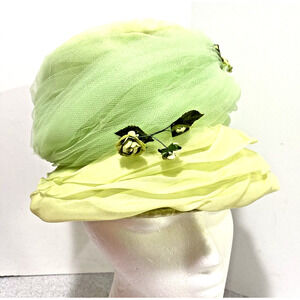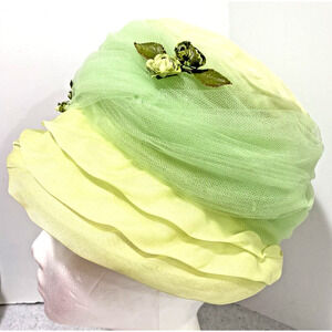 Mid Century Pill Box Hat Pastel Greens Chiffon Dressy Floral Millinery Cottage