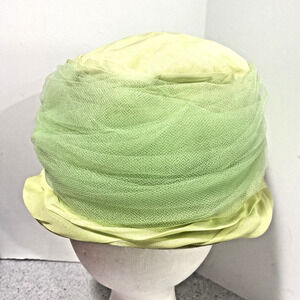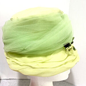 Vintage Mid Century Pastel Green Pill Box Hat - this is a dressy hat with lime green chiffon netting wrapped around and tiny floral millinery scattered on the crown. Velvet trim and inner hatband - stiff netting structure - this hat looks like it was handmade for a special event. No tags or other age indicators but this is a wonderful 1950's design to add to your collection today. Minor wear primarily on the interior - minor wear on the exterior - no damage or flaws - so pretty!