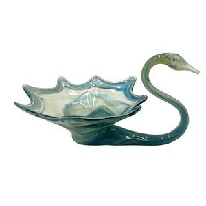 This exquisite vintage Art glass , swan bowl, crafted from hand-blown glass, embodies the artistry of bygone eras. Its elegant curves and delicate hues offer a graceful touch to any collection or display setting. The interplay of colors creates a captivating visual appeal reminiscent of a serene water scene, making it a timeless decorative piece.