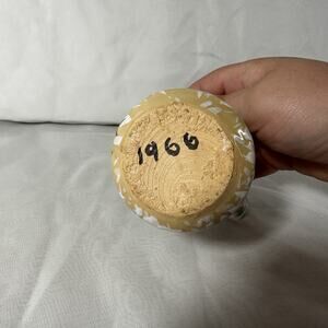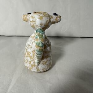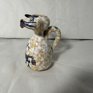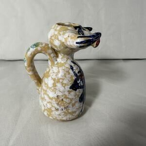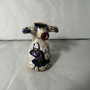 This vintage 1966 Spanish cow bull figure creamer pot is a unique and handmade piece of pottery crafted in Spain. The multicolor ceramic design features a cow bull figure, adding a playful and artistic touch to your kitchen decor. This unmarked brand creamer is not only functional for serving cream but also serves as a charming decorative piece for your dining table. Its rarity and distinctive design make it a valuable addition to any collection of vintage pottery.