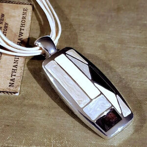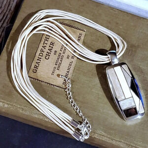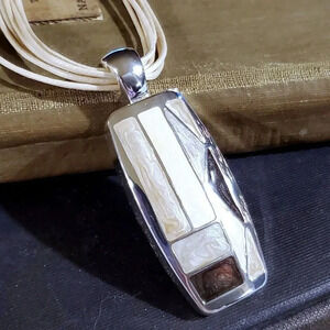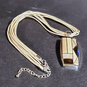 Mid Century Style Cream Tan Dark Brown Silver White Rectangular Pendant Necklace