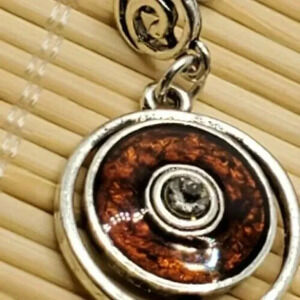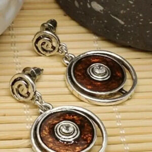 Chic dangle earrings have silver round drops accented with brown enamel and crystal rhinestones
