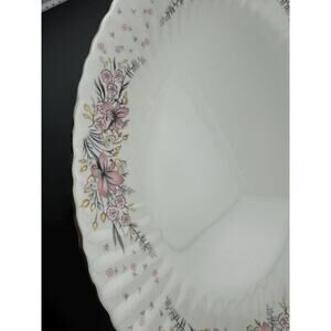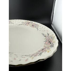 Large, 14" serving platter by Syracuse China. Elizabeth, lily pattern with soft pink lilies, yellow florals and light grey. Silver rim. No major blemishes, chips or cracks noted.