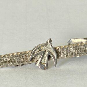 This vintage tie clip features a textured silver tone with an bird design, adding a touch of Mid Century class to any formal outfit.