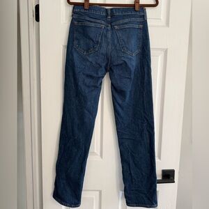 Our classic 90s straight fit in a dark wash with a clean hem. Features a mid rise that is fitted at the waist through the seat to show off your best butt. Slightly eases at the thigh into a true full-length, straight leg shape. Made from our Vintage Comfort Stretch fabric with structure and slight stretch. This jean was designed to hit at the top of the shoe. Imported.