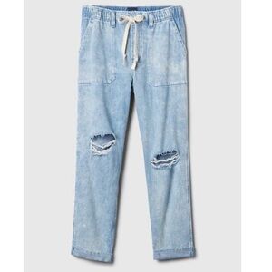 Casual light blue denim joggers. Elastic waistband with drawstring. Comfortable and stylish.