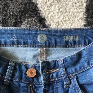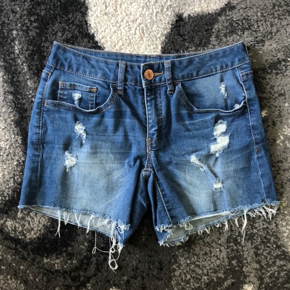 Mid rise, super comfy, jean shorts, mild distressing, light to mid wash