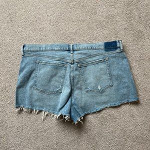 Mid-rise denim mom shorts in a light wash featuring distressed details, raw-cut hem and zipper fly. Imported.Body:99% Cotton, 1% Elastane. Never worn. New With Tags.