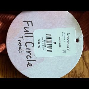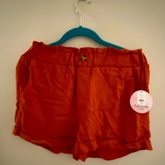 Burnt Orange/ rust color. Runs a little small, probably best fit if you normally wear a S or XS for a looser fit. Mid rise with elastic waistband. 100% rayon. Never worn with original tags. Brown front button.