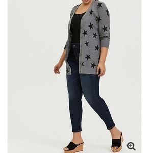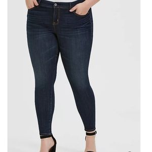 Super Soft Stretch Dark Wash. Never Worn. Comes to about ankle.