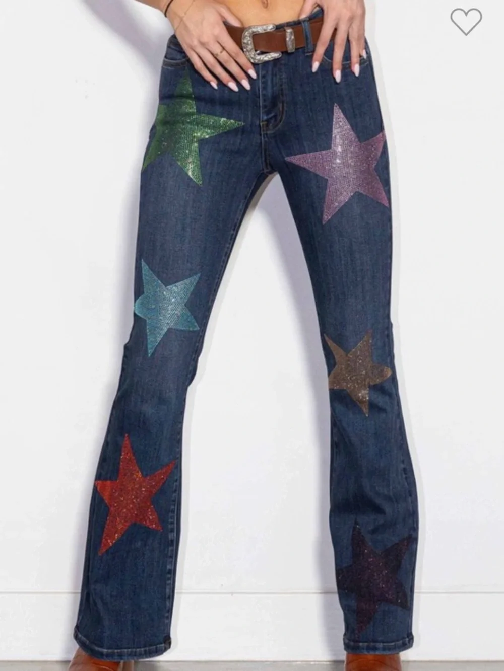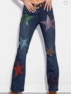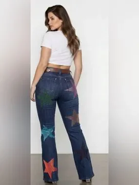 A pair of mid-rise bootcut jeans featuring colorful star shape rhinestone embellishment, classic 5-pocket construction and a zip fly closure.