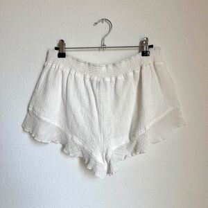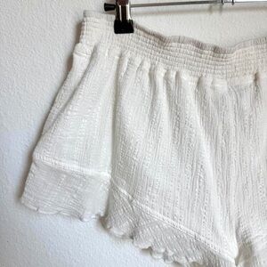 White breezy shorts mid rise, smocked elastic waistband and ruffled hem