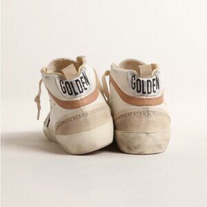 Uniquely elegant versatility: the Mid Star sneakers take a refined approach to their Nineties skate scene inspiration. This model with a white nappa leather upper with ecru cotton trim features a brown glitter star and a nude waxed leather flash. The silver metallic leather heel tab, beige suede insert on the back and ecru laces complete the look.