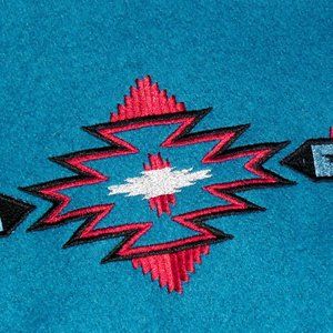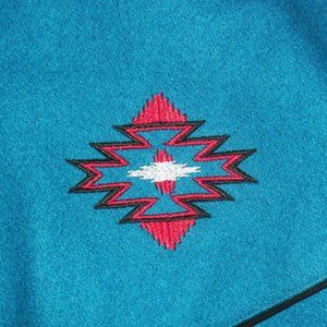 Brand New Vintage Original 90s Mens sz. Large Aztec Print Teal Colored Full zip up Jacket Coat. Made by Mid West Garment Co. The top front of the jacket has the sewn on embroidered in Aztec design on it. The back also has the sewn on embroidered Aztec design on it as well. Super Rare. The shell of the jacket is made of wool material. The inner lining is made of nylon polyester material. It measures from top of collar to bottom of coat is 29 inches and from armpit to armpit is 27 inches.