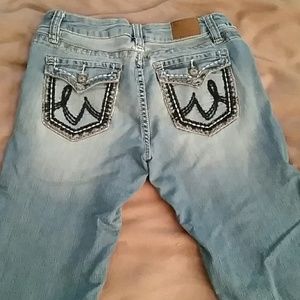 Mid calf (almost boyfriend cut) blue jeans with design on back pocket.