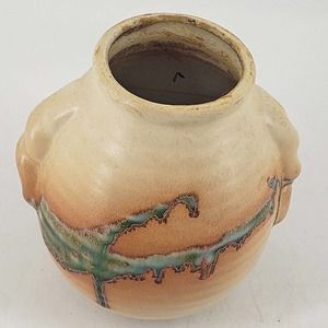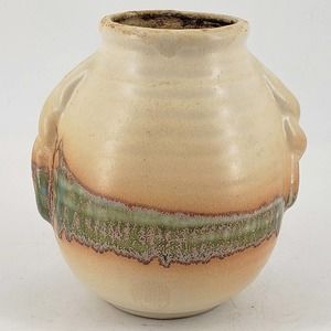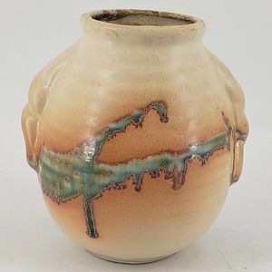 MID CENTURY BOHO STYLE STUDIO ART SMALL CERAMIC BUD VASE W ROPE STYLE HANDLES. MEASURES ABOUT 4.25" T, 4" D. IN EXCELLENT CONDITION, NO FLAWS.