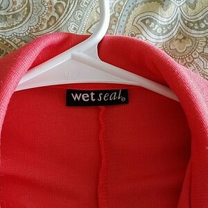 Tangerine color jacket to wear over a yank, camisole, or blouse. Great for spring. Made of polyester, rayon, and spandex. Size medium from Wet Seal. Only worn 1 or 2 times. Like new.