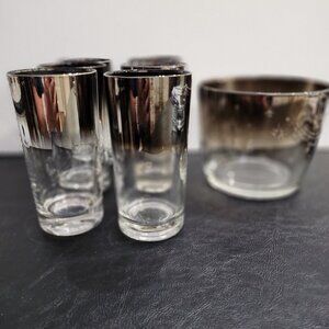 This is a cool set of highball glasses and ice bucket together and a silver carrying rack. The ice bucket has the silver metallic atomic star pattern on it. The glasses are the same as the bucket, but without the stars. They are 5 1/2 inches tall, 2 3/4 inches across the top. The glasses and bucket have a smoky, black silver band, 1/3 of the way down the bucket. The bucket measures 5 3/4 inches in diameter, 5 inches tall. This vintage 1950's set is in very nice condition I don't see any flaws. The ice bucket doesn't want to set very well in its designated hole. But once you get it positioned correctly, it stays. A very neat bar set. Non smoking pet free home. @ ER Mid Bottom Shelf
