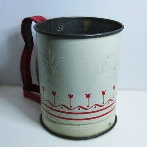 The sifter features a tulip-stenciled motif and red-painted handle, emblematic of postwar home design that blended function and optimism.