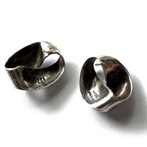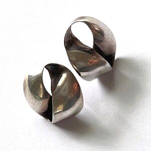 Vintage, Mid-Century, Scandi - Inspired simple elegant and unusual silver earrings. The open center design creates a feeling of eternal movement with the rich silver ribbon weaving back on itself.