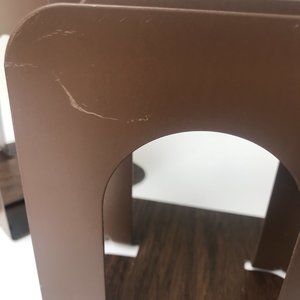 Faux wood metal bookends with a matte finish. The back are powder coated in a solid brown color. The wood grain pattern is a bit lighter in color than the photos show. Sold in a set of two. Three sets are available. Marked "Rogers Madison, Wis." on the bottom.