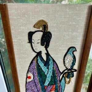 Beautiful pair of Mid-Century Modern gravel art wall hangings featuring elegant Asian-inspired figures crafted from colored crushed stone, enamel beads, and textured materials. Each piece is mounted on a linen-style fabric background and framed in warm walnut-toned wood.