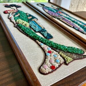 These striking wall pieces showcase exquisite mid-century craftsmanship with vibrant shades of emerald green, turquoise, lavender, coral, and ivory. Perfect for adding texture and vintage flair to a living room, hallway, or retro-inspired space.