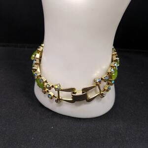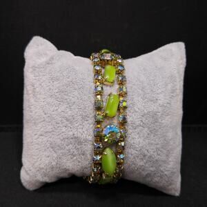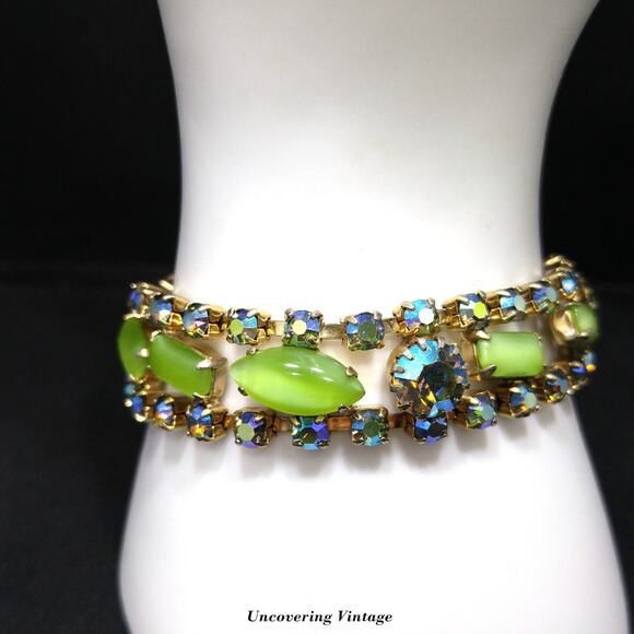 Mid-Century Green Blue AB Rhinestone Bracelet, Aurora Borealis, 1950s Vintage