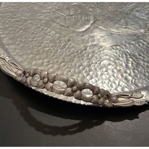 Hand Wrought Hammered Aluminum design of a beautiful bouquet of tulips. Diameter is 16in. Has beautiful floral handles on each side. Please zoom in on photos.