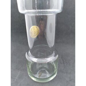 This mid-century modern cocktail pitcher, adorned with a raised antique gold finish medallion, offers an elegant touch to your barware collection. Ideal for both serving and displaying, its clear glass design ensures versatility and aesthetic appeal.