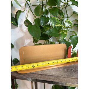 Unique retro wall shelf with a sleek gold finish and red accent hooks. Features a minimalist curved design with round cutout details, perfect for adding a touch of mid-century style to any space. Great for hanging keys, hats, or displaying small décor.