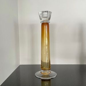 Super chic column candlestick holder with major MCM vibes. Holder is tall, with orange-yellow ombre coloring on the column, accented with clear holder at top and clear base at bottom. Holder still has sticker on the holder (see photo), though, I can't find much that references it. Holder is real glass with air bubbles visible.
