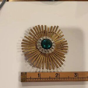 Benefits Charity! Vintage MCM Mid-Century Modern Undulating Atomic Starburst Style Gold Tone & Rhinestone Brooch. Unsigned. The center stone is a blue green in color depending on the light. This stunning brooch has an almost wave feature to the rays coming out from the center. Very Mad Men Style!