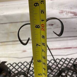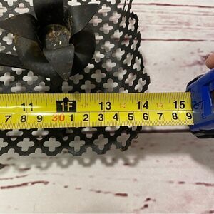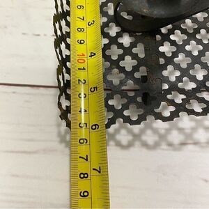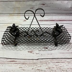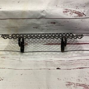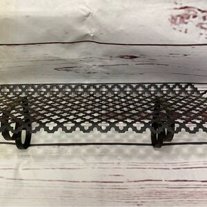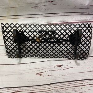 Mid Century Black Perforated Metal Shelf and Matching Candle stand. Cloverleaf pattern black sheet metal. Nice scroll work. Factory painted black.