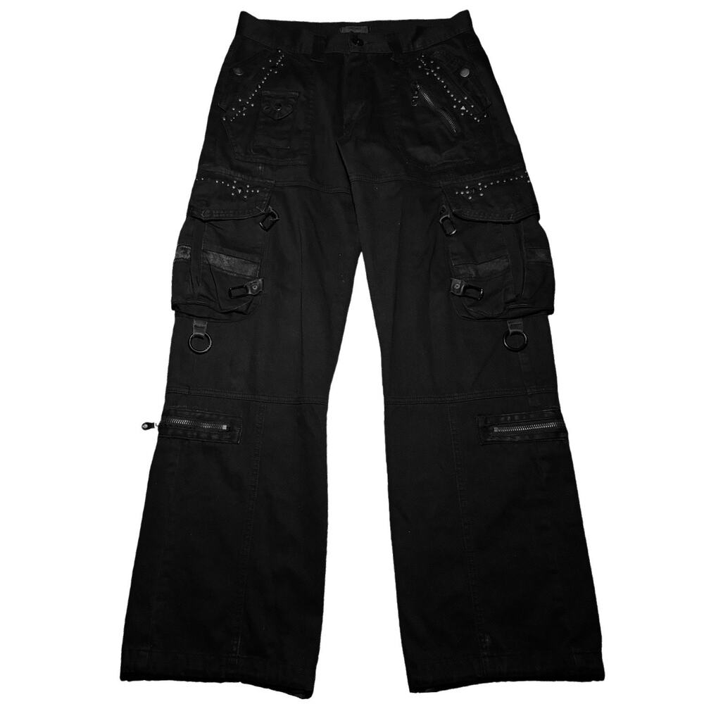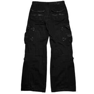 / These mixed-material cargo pants feature a wide bottom leg, 10 pockets and assorted studs throughout. Also comes with 2 removable bondage straps