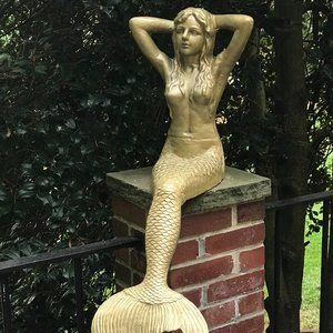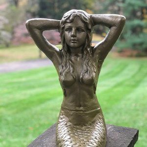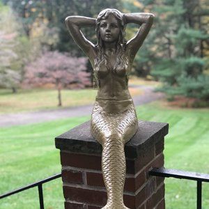 Stunning vintage cast-iron mermaid sculpture of unknown origin, no discernible makers-mark, but believed to be mid-century, making this piece approximately 70 years old. Minor defects as illustrated in listing photos.