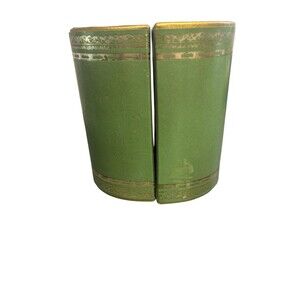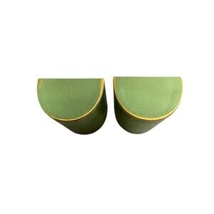 These midcentury olive green and gold half circle bookends are a stylish and unique addition to any vintage home decor collection. The elegant design featuring a curved shape and bold green color with a touch of gold finish adds a touch of retro charm to any bookshelf or desk. Perfect for book lovers or collectors looking for a statement piece to showcase their love for midcentury design. Used condition, see pictures. Refer to pictures for measurements. Very pretty.
