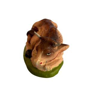 This midcentury paper mache cow figurine showcases a seated brown cow on a green base. Measuring 4.5 inches, its hand-painted details portray realism and subtle wear consistent with vintage Japanese craftsmanship. A unique collectible for art and design enthusiasts.