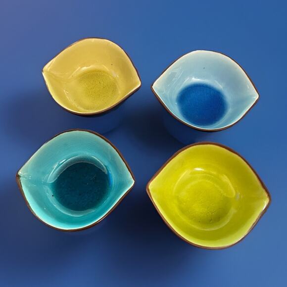 This midcentury set of 4 crackle glazed multicolor dip dessert bowls features a leaf shape and a height of 1.75 inches. Made of pottery, these decorative bowls are perfect for all occasions and add a touch of art pottery production style to your table setting. The glossy finish and unique crackled pattern make them a standout addition to any collection, measuring 4.5 inches in diameter. Colors are Blue, Gold, Aqua, and Citron with a brown edging and flat black underside.