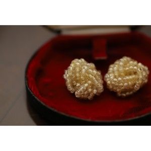 Midcentury, 1950s vintage twisted bead clip earrings. These vintage earrings will complement any outfit. They are an off white / clear color and are unmarked in very good vintage condition. Vintage box not included. XOXO