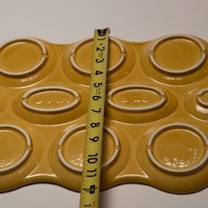 Very cool midcentury yellow ceramic condiment platter. This piece is in very good vintage condition with no chips, cracks, or damage but does have some crazing. The platter has some weight and is well made. Item will be packaged properly for shipping. Made in the USA is marked on the bottom of the platter. Please refer to photos for item condition and dimensions, Beautiful unique piece!