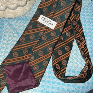Mid century bronze and green men’s tie by Qiana for Montgomery Ward. This is new old stock, 100% nylon vibrant beautiful colors and a very nice thick quality tie