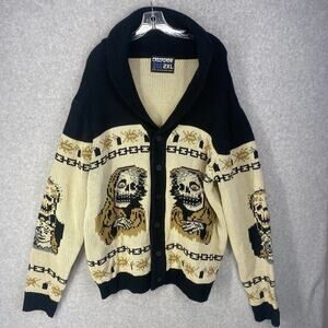 Middle Beyond men’s cardigan, size 2XL. Tan knit with Creepshow design, perfect for Halloween, horror fans, or collectors.