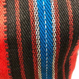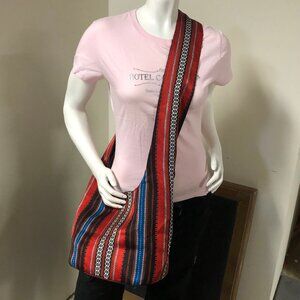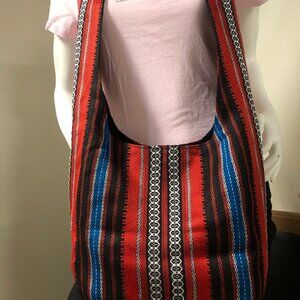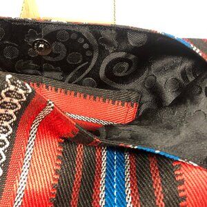 This unique over-the-shoulder bag is a one-of-a-kind. The design features a striped tribal design. Mainly red with some blue white & black stripes. The inside is lined with a silky black shadow print.