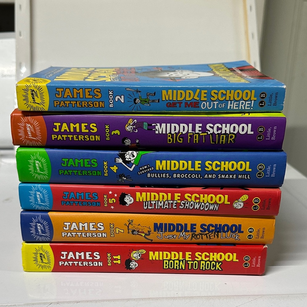 Explore the exciting Middle School series by . This set features colorful covers in blue, purple, green, orange, red, and yellow, perfect for young readers.