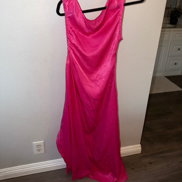 Hard to see in photos but this is an off the shoulder wrap dress wit a cutout on the left side. Has a slit on the left leg. Worn once to a wedding. Very lightweight fabric and a shiny finish.